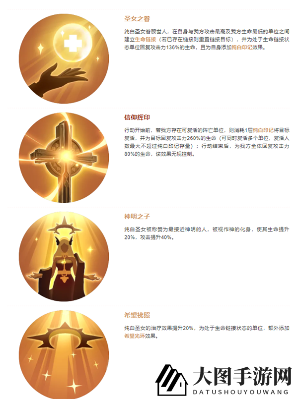 ③ 希望之光:纯白圣女的治疗能力得到提升,为生命纽带中的同伴提供希望光环;【希望光环】:增加8%暴击率、8%抗暴、8%治疗,光系单位效果加倍,直至战斗结束;