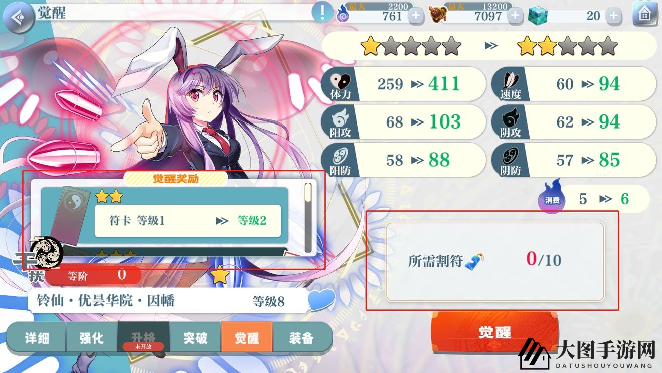 觉醒:通过觉醒提升角色的六维属性、星级和符卡伤害,觉醒所需道具为割符,来源包括贩卖角色和绘礼;觉醒同样会增加出击消耗。