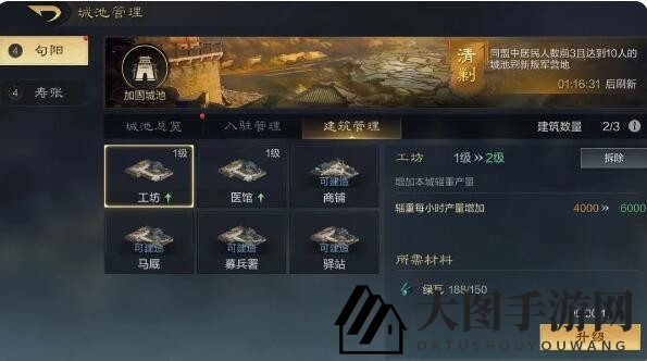 同盟城池无需额外操作,即可自动生成辎重,每小时产量直接与城池“工坊”等级挂钩。若要提高产量,可以选择扩大城池规模或是提升工坊等级。