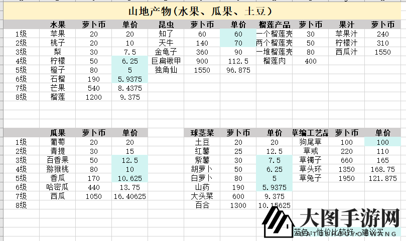 紫甘蓝、南瓜等高等级菜,萤火虫、独角仙等高级虫,高等级鱼(用量少 性价比低)