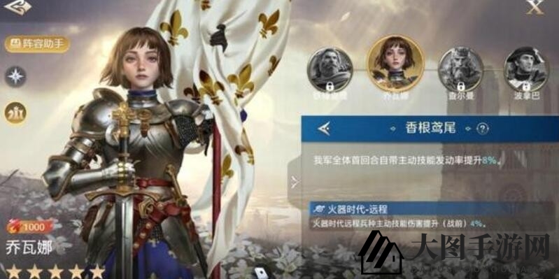 3、乔瓦娜还能与铁锤查理、查尔曼和波拿巴组成命运羁绊“香根鸢尾”,使我军全体首回合自带主动技能发动率提升8%。