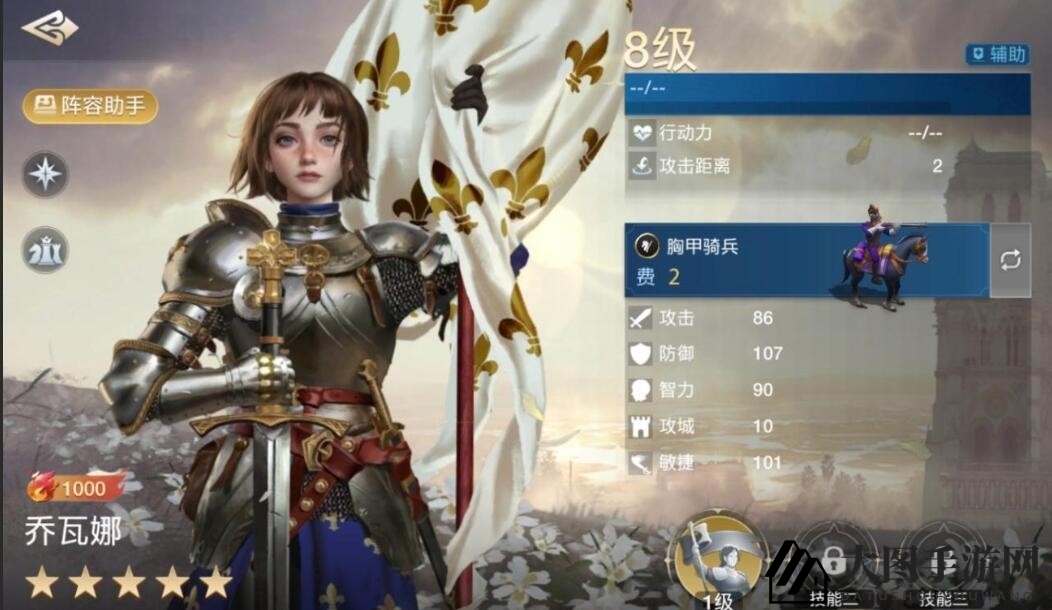 乔瓦娜精通骑兵战术。她的攻击范围为2,通常与辅助型或防御型骑兵搭配,由于攻击距离有限,常位于阵前,负责为团队吸收伤害。