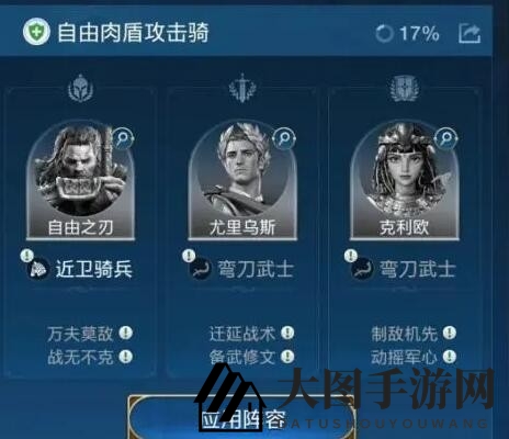 3、在兵种配置上,安东尼奥负责携带防御型近战兵种,克利欧则携带智力输出兵种,而尤里乌斯则携带辅助兵种。
