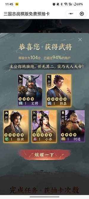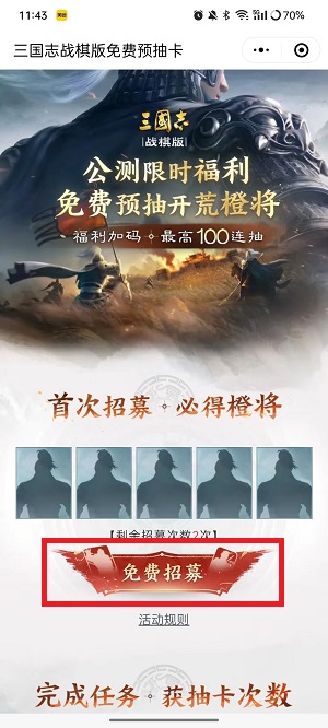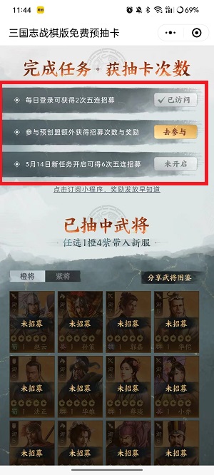 参与活动超简单:只需使用微信小程序,你就能轻松参与每日在线抽卡,赢取珍贵的橙卡和紫卡。只要活动期间成功兑换,公测后即可解锁心仪的武将。